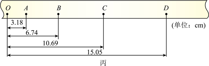 (3)一小车在重物牵引下拖着穿过打点计时器的纸带沿平直轨道加速运动。图丙是打出的一段纸带,图中O、A、B、C、D为计数点,相邻的两个计数点之间还有4个计时点未画出,打点计时器所用电源的频率为50Hz。