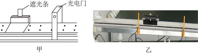 1.如图甲所示,利用遮光条和光电门能够较为精确的测量物体的速度。图乙中一滑块沿倾斜气垫导轨向上运动,先后穿过两个光电门时的挡光时间分别为t1=0.10s、t2=0.20s,遮光条宽度d=2cm,遮光条从开始挡住第1个光电门到开始挡住第2个光电门的时间间隔t=2s。