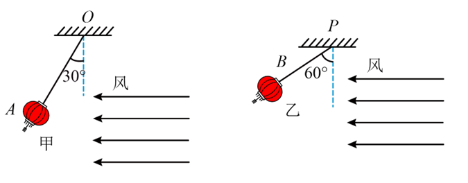 1.如图所示,用两根轻绳把质量不同的灯笼甲和灯笼乙分别悬挂在O、P两点。起风时,灯笼甲、乙受到相等且恒定的水平风力而保持静止,此时轻绳OA、PB与竖直方向的夹角分别为30°、60°。已知灯笼甲的质量为m,重力加速度为g,求: