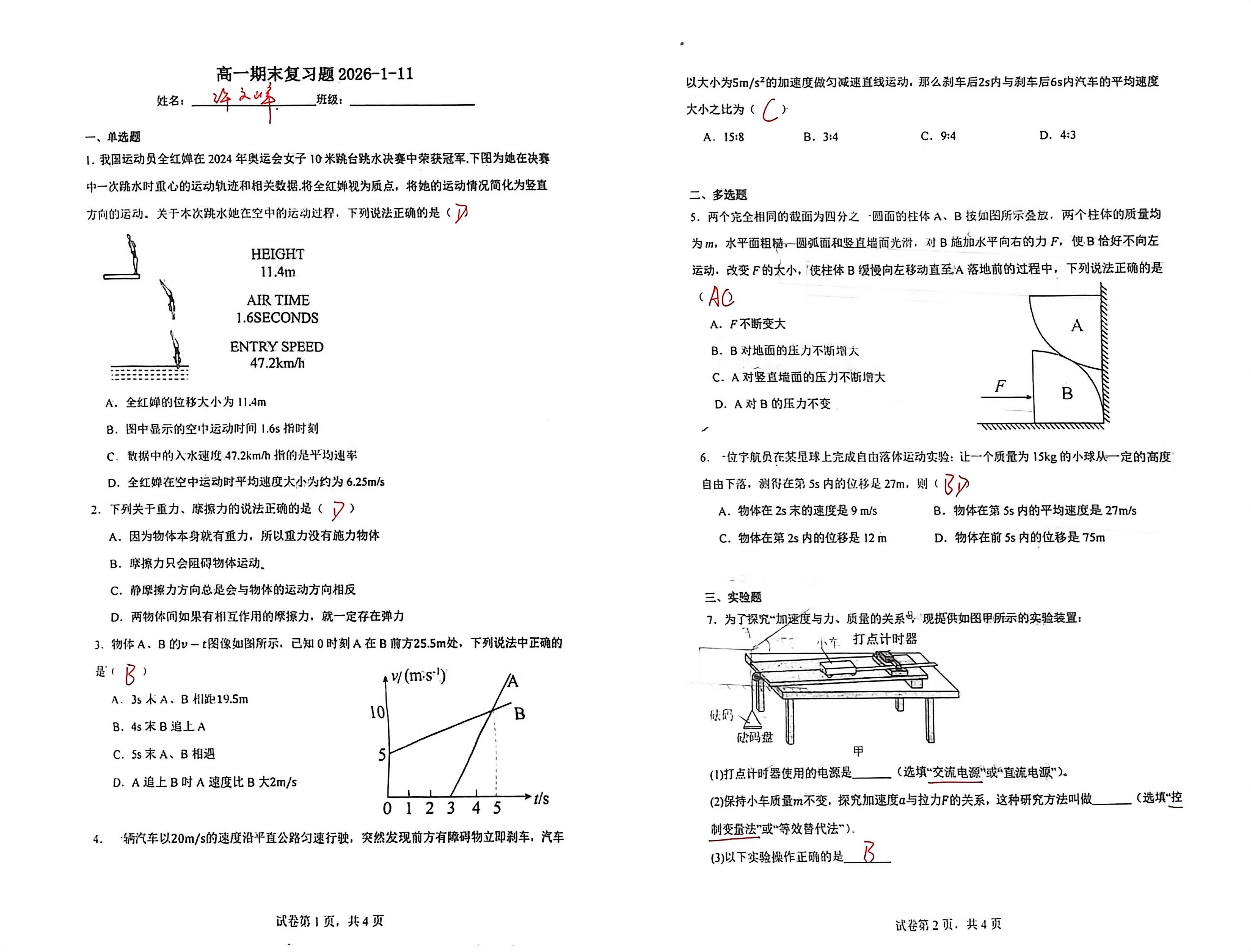 高一期末复习题2026-1-11(答案)